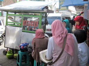 Zelda dan bundanya makan Batagor di dekat Pasar Baru BandungTapi berbeda dengan liburan akhir tahun 2013 lalu saat saya ke Bandung. Karena berangkat bareng keluarga, saya tidak mau berpetualangan sendiri. Alias jalan-jalan sendiri. Maka saya, istri dan Zelda (anak saya yang terakhir) naik sepeda motor. Tujuan utamanya adalah ke pasar Baru.