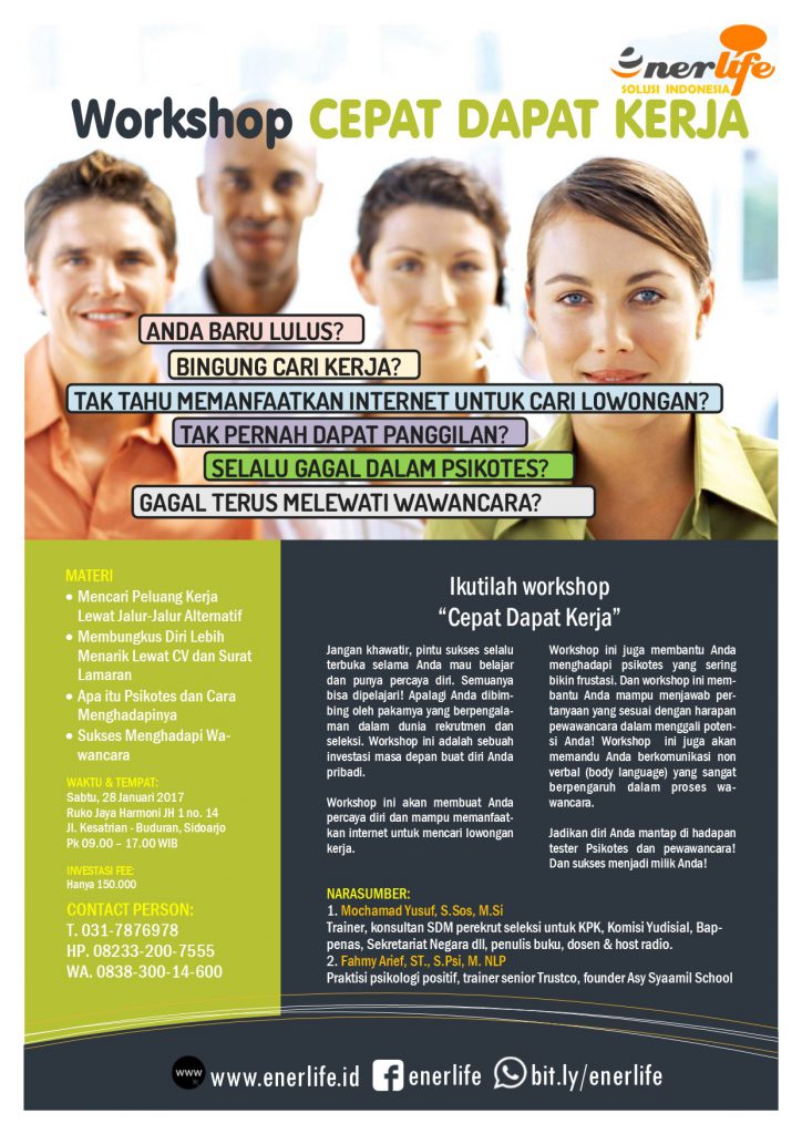 Jadikan diri Anda mantap di hadapan tester Psikotes dan pewawancara! Dan sukses menjadi milik Anda! MATERI WORKSHOP 1. Mencari Peluang Kerja Lewat Jalur-Jalur Alternatif” 2. Membungkus Diri Lebih Menarik Lewat CV dan Surat Lamaran 3. Apa itu Psikotes dan Cara Menghadapinya 4. Sukses Menghadapi Wawancara NARASUMBER: 1. Mochamad Yusuf, S.Sos, M.Si Trainer, konsultan SDM perekrut seleksi untuk KPK, Komisi Yudisial, Bappenas, Kementerian Sekretariat Negara dll, penulis buku, dosen dan host radio. 2. Fahmy Arief, ST., S.Psi, M. NLP Praktisi psikologi positif, trainer senior Trustco, founder Asy Syaamil School WAKTU DAN TEMPAT: Sabtu, 28 Januari 2017 Ruko Jaya Harmoni JH 1 no. 14 Jl. Kesatriaan – Buduran Sidoarjo Pk 09.00 – 16.00 WIB INVESTASI FEE: Hanya 150.000 CONTACT PERSON: T. 031-7876978 HP. 08233-200-7555 WA. 0838-300-14-600